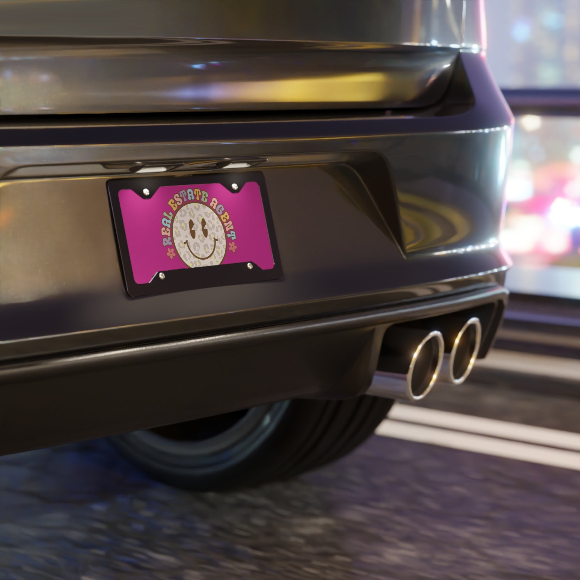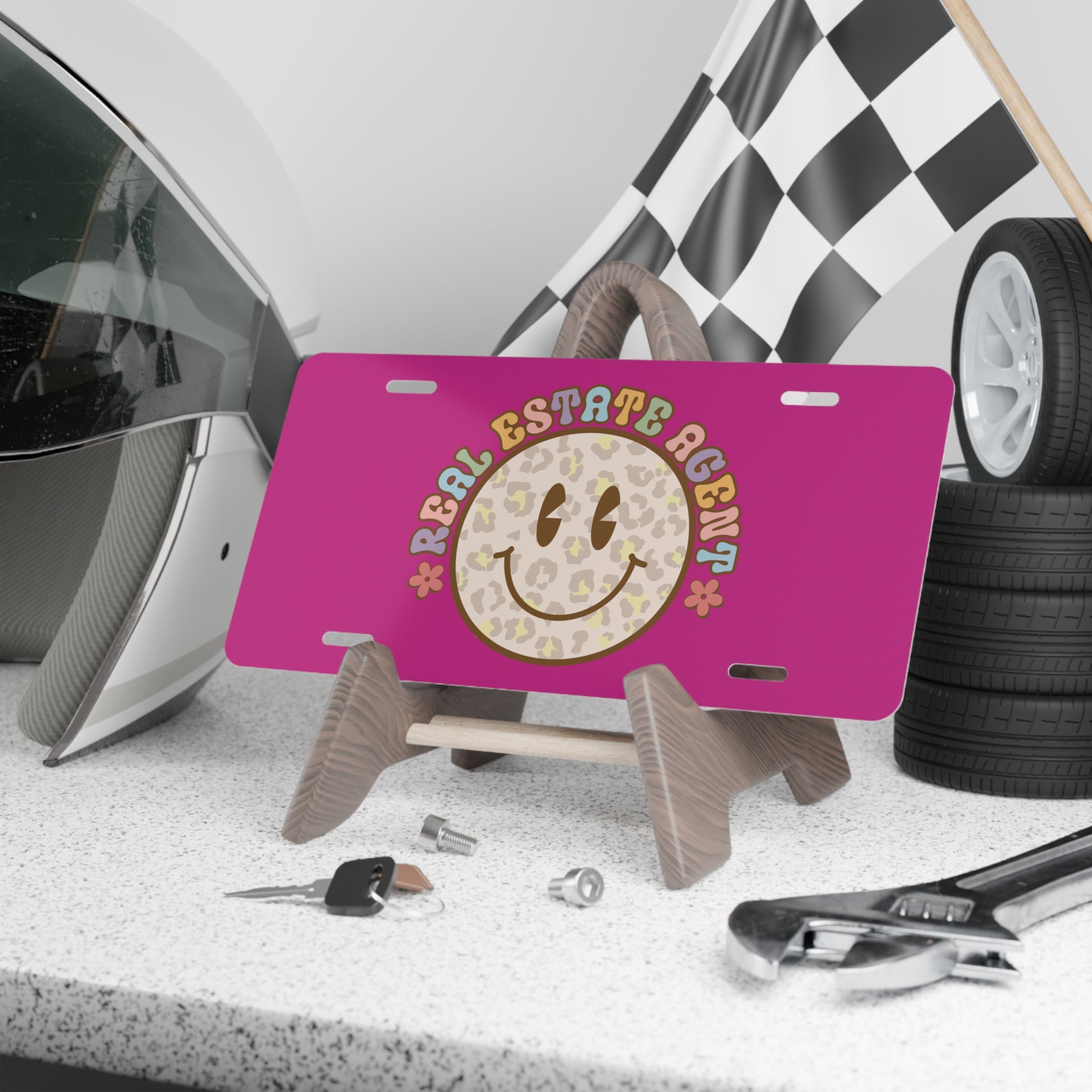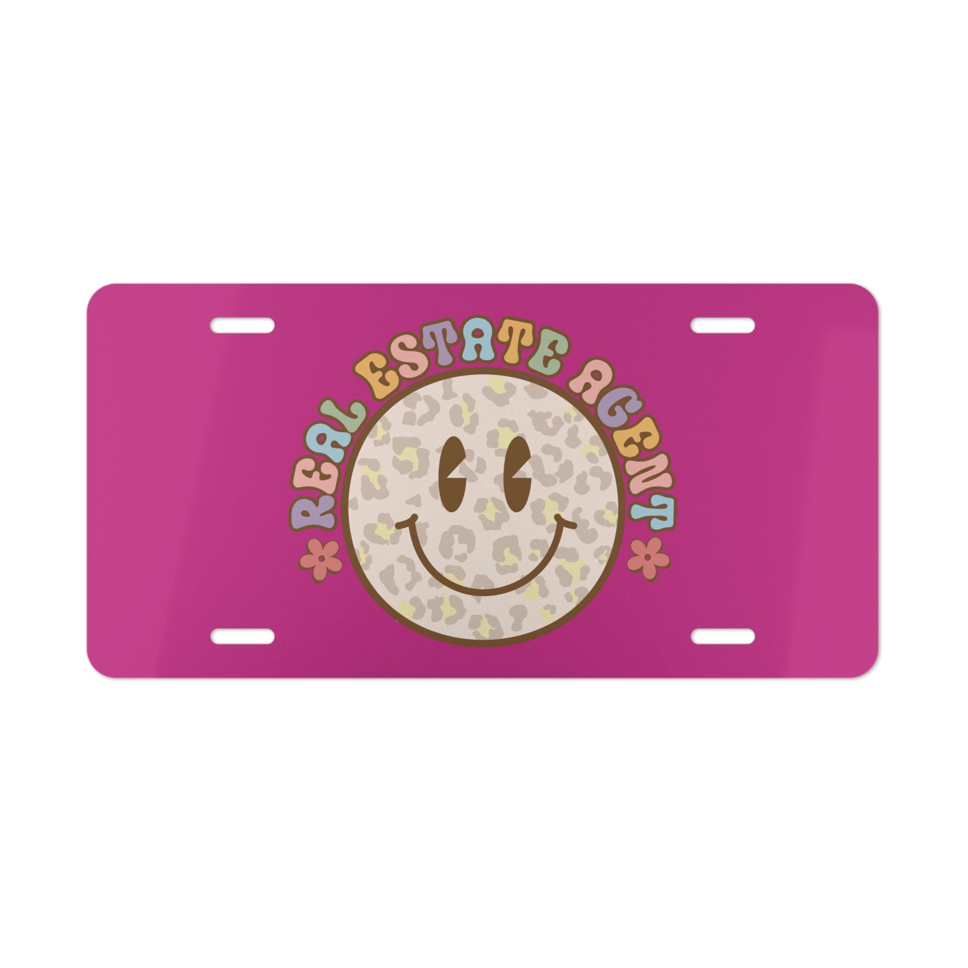 Smiley Face Real Estate Agent License Plate – Retro Vibes, Leopard Style, Realtor Sass